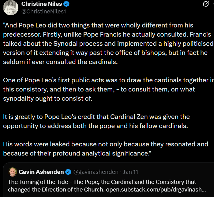 To cite Chris Jackson, we are witnessing the global “cementing” of the Bergoglian catechesis. Meanwhile Neo-Cons & Trad Inc. fawn over how smooth Leo was at the consistory, how nice he was to the Cardinals, and other such juvenile & irrelevant this-and-that (see the twitter post by Christine Niles below), while the revolution marches unabated under the new Warden (to cite Stephen Kokx’s analogy).